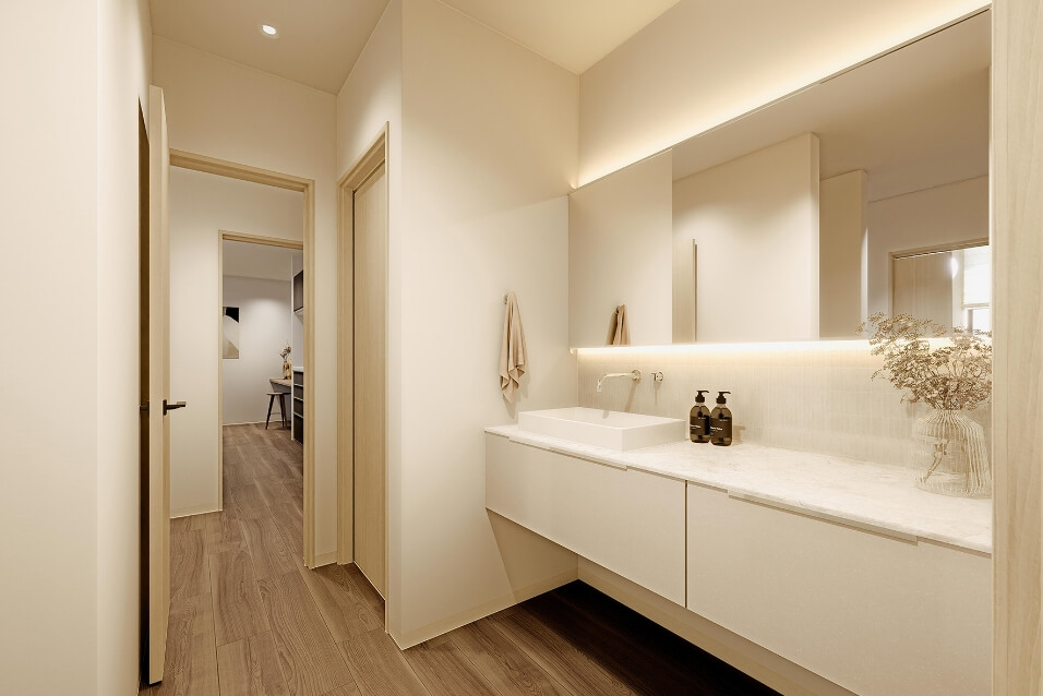 水回りは回遊動線となっており、帰宅した後は洗面、脱衣・ランドリーを通り、きれいな状態でLDKに入ることができる事と、キッチンから脱衣・ランドリーに抜ける動線をつくる事で家事動線にも配慮させて頂いております。